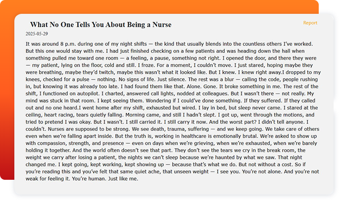 Anonymously create health related posts that only licensed health professionals can answer. Share your questions, story and experiences in our healthcare system. Responses are not limited to only one person or profession, but are open to multiple health professionals.